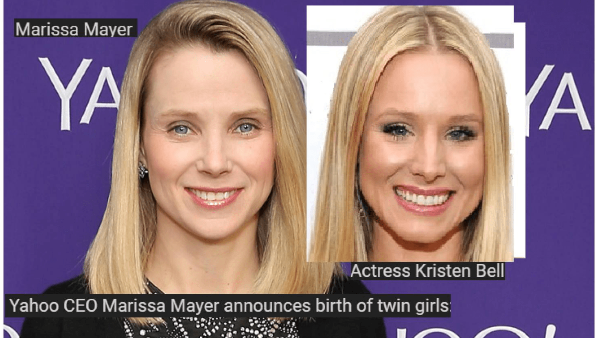 May 1, 2017 Yahoo CEO Marissa Mayer = Kristen Bell, actress… WORLD EXCLUSIVE! Share this: Share on X (Opens in new window) X Share on Facebook (Opens in new window) Facebook Like Loading... Related