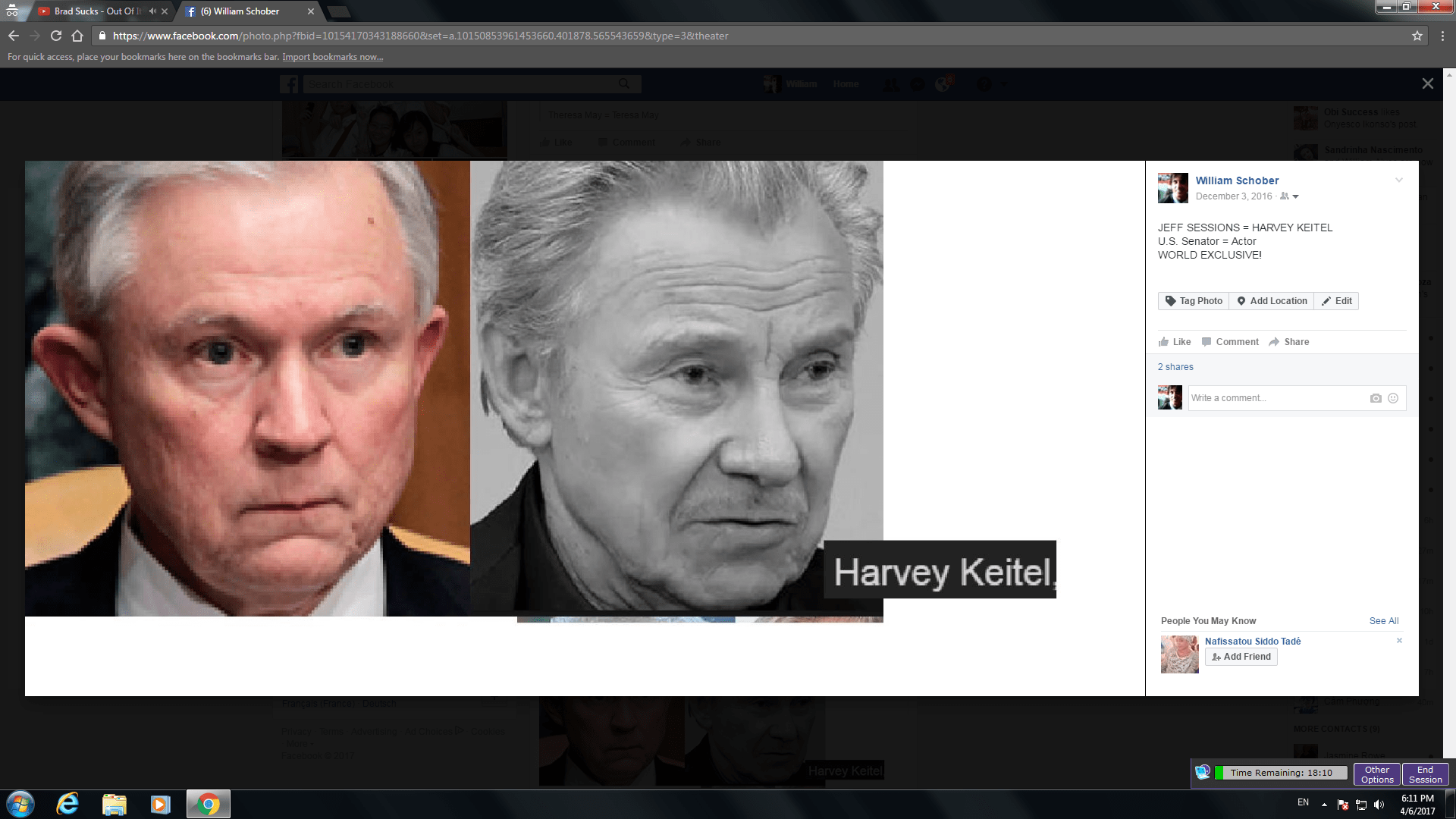 May 15, 2017 Trump’s D.O.J. Chief Jeff Sessions = Harvey Keitel, movie actor … WORLD EXCLUSIVE! Share this: Click to share on X (Opens in new window) X Click to share on Facebook (Opens in new window) Facebook Like Loading... Related