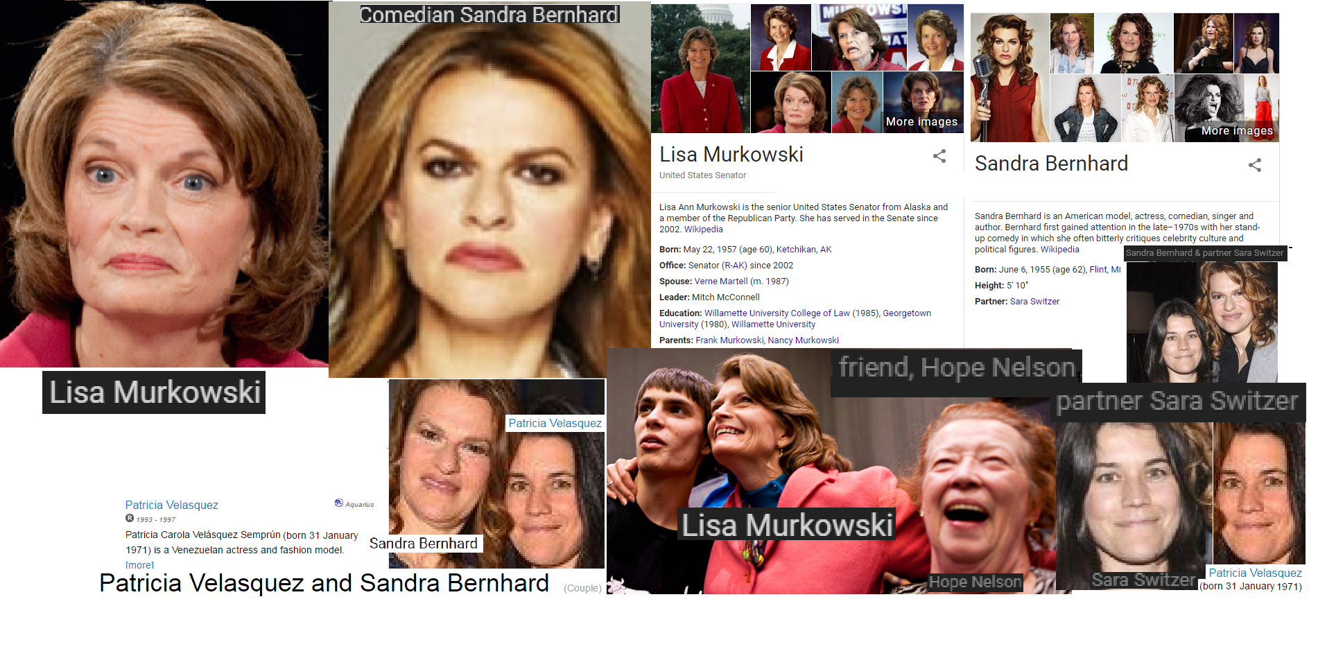 June 8, 2017 Sen. Lisa Murkowski = Sandra Bernhard .. Alaskan U.S. Senator = lesbian comedian … WORLD EXCLUSIVE! Share this: Share on X (Opens in new window) X Share on Facebook (Opens in new window) Facebook Like Loading... Related