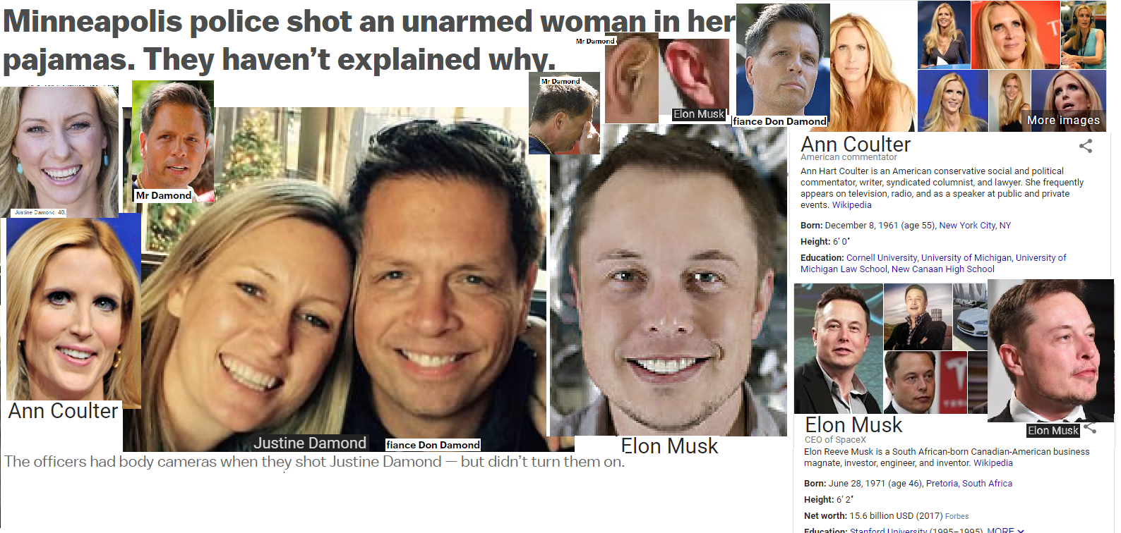 July 19, 2017 Mr. Don Damond = Elon Musk, CEO Justine Damond = Ann Coulter, WORLD EXCLUSIVE! A Big Hoax Shooting! Share this: Share on X (Opens in new window) X Share on Facebook (Opens in new window) Facebook Like Loading... Related