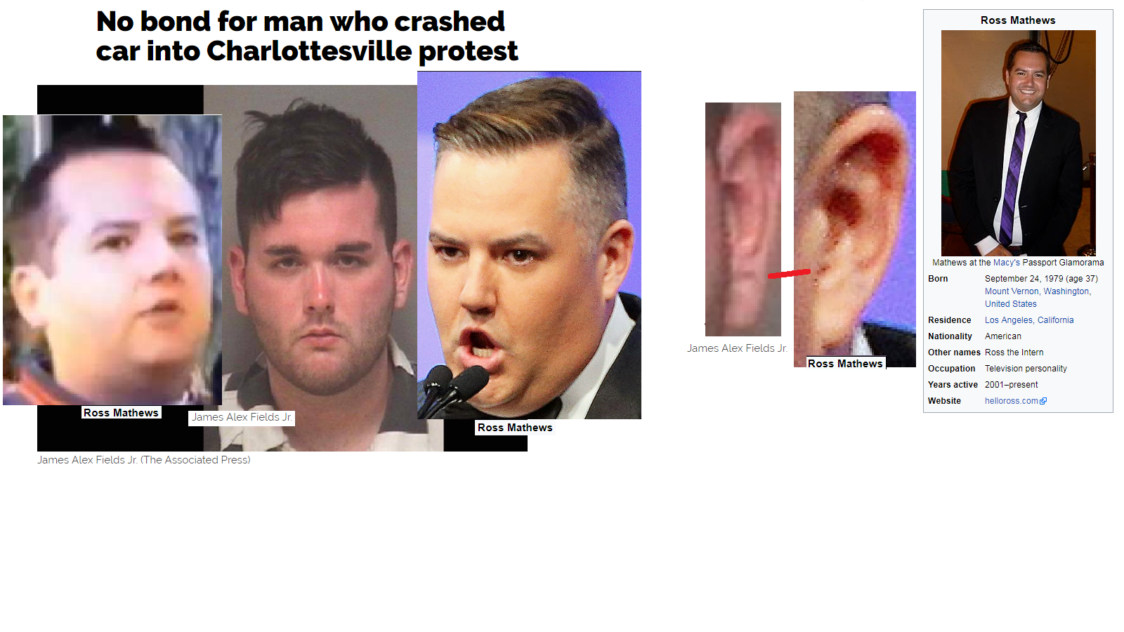 August 15, 2017 Charlottesville protest car-crasher = TV personality … JAMES ALEX FIELDS JR. = ROSS MATHEWS … World Exclusive! Share this: Share on X (Opens in new window) X Share on Facebook (Opens in new window) Facebook Like Loading... Related