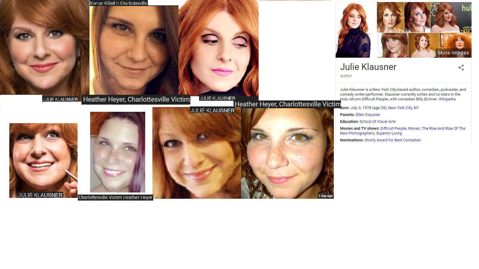 August 15, 2017 Charlottesville white-supremacist protest victim = author/actress. HEATHER HEYER = JULIE KLAUSNER … World Exclusive! Share this: Share on X (Opens in new window) X Share on Facebook (Opens in new window) Facebook Like Loading... Related