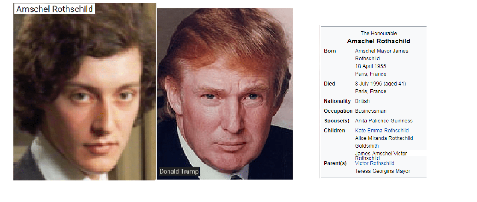 December 15, 2017 Donald Trump = Amschel Rothschild … EXPOSED HERE 1ST! Share this: Share on X (Opens in new window) X Share on Facebook (Opens in new window) Facebook Like Loading... Related