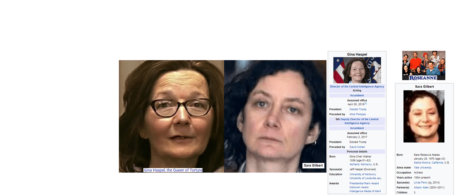 May 7, 2018 Acting CIA Director and “Torture Queen” GINA HASPEL = SARA GILBERT, actress from the “Rosanne Show.” Share this: Share on X (Opens in new window) X Share on Facebook (Opens in new window) Facebook Like Loading... Related