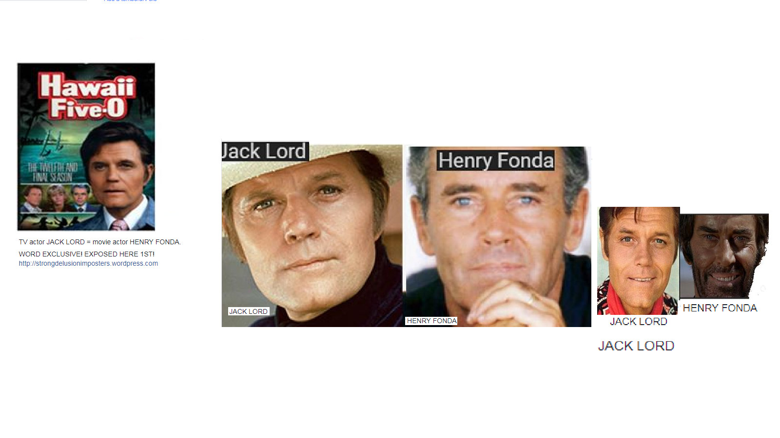 May 22, 2018 TV actor, JACK LORD = HENRY FONDA, movie actor ….. exposed here 1st! Share this: Share on X (Opens in new window) X Share on Facebook (Opens in new window) Facebook Like Loading... Related