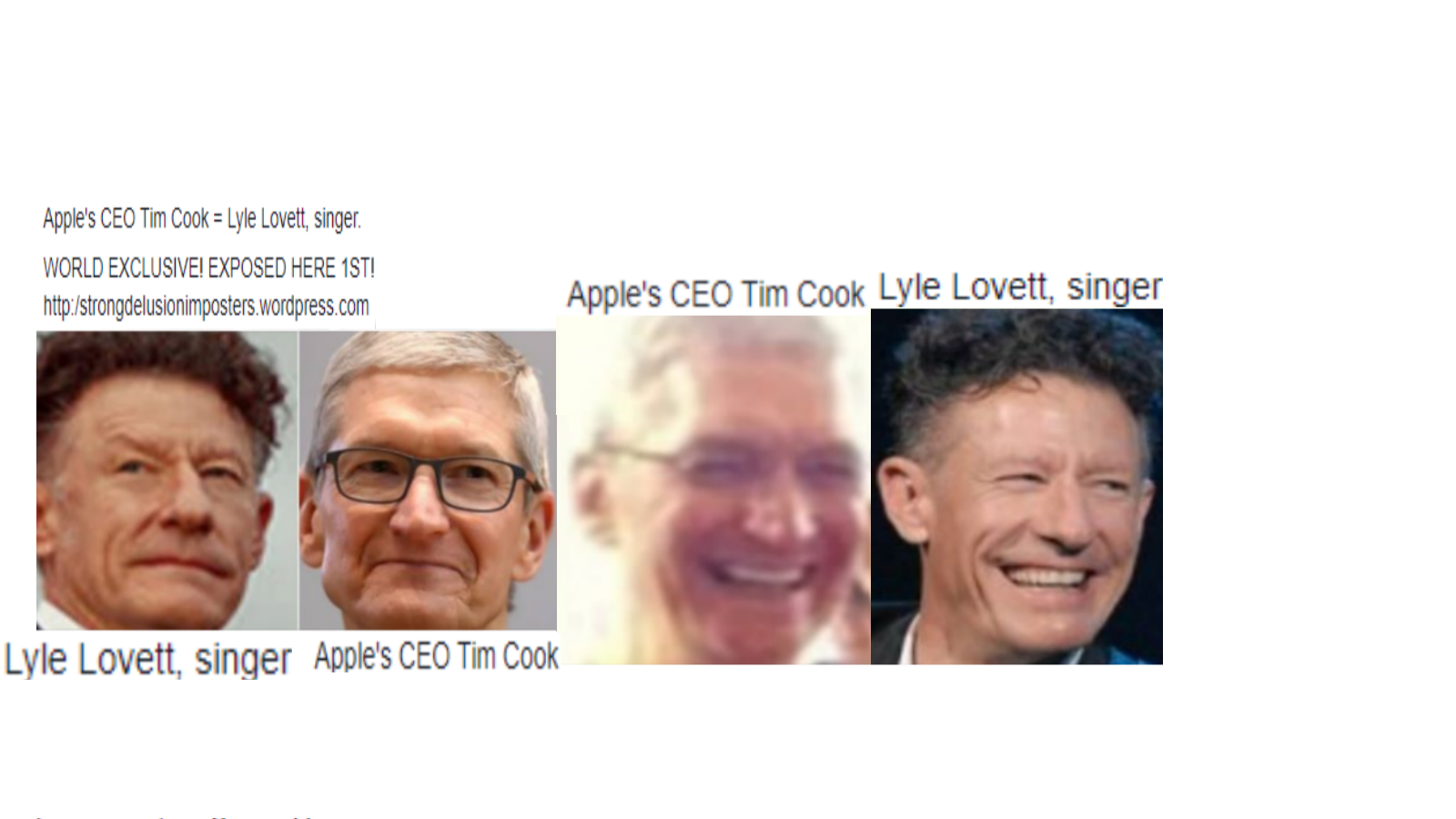 June 3, 2018June 3, 2018 Apple’s CEO: Tim Cook = Lyle Lovett, singer … EXPOSED HERE 1ST! Share this: Share on X (Opens in new window) X Share on Facebook (Opens in new window) Facebook Like Loading... Related