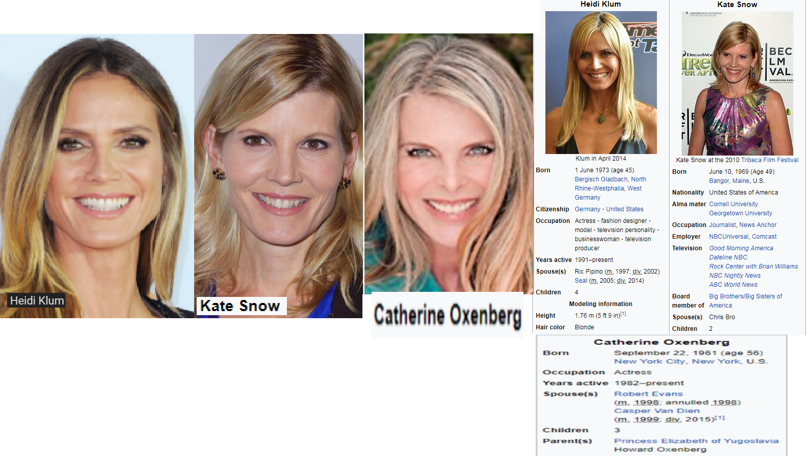 August 7, 2018 model, HEIDI KLUM = newscaster, KATE SNOW = CATHERINE OXENBERG, actress and Yugoslavian royal … Exposed here 1st! World Share this: Share on X (Opens in new window) X Share on Facebook (Opens in new window) Facebook Like Loading... Related
