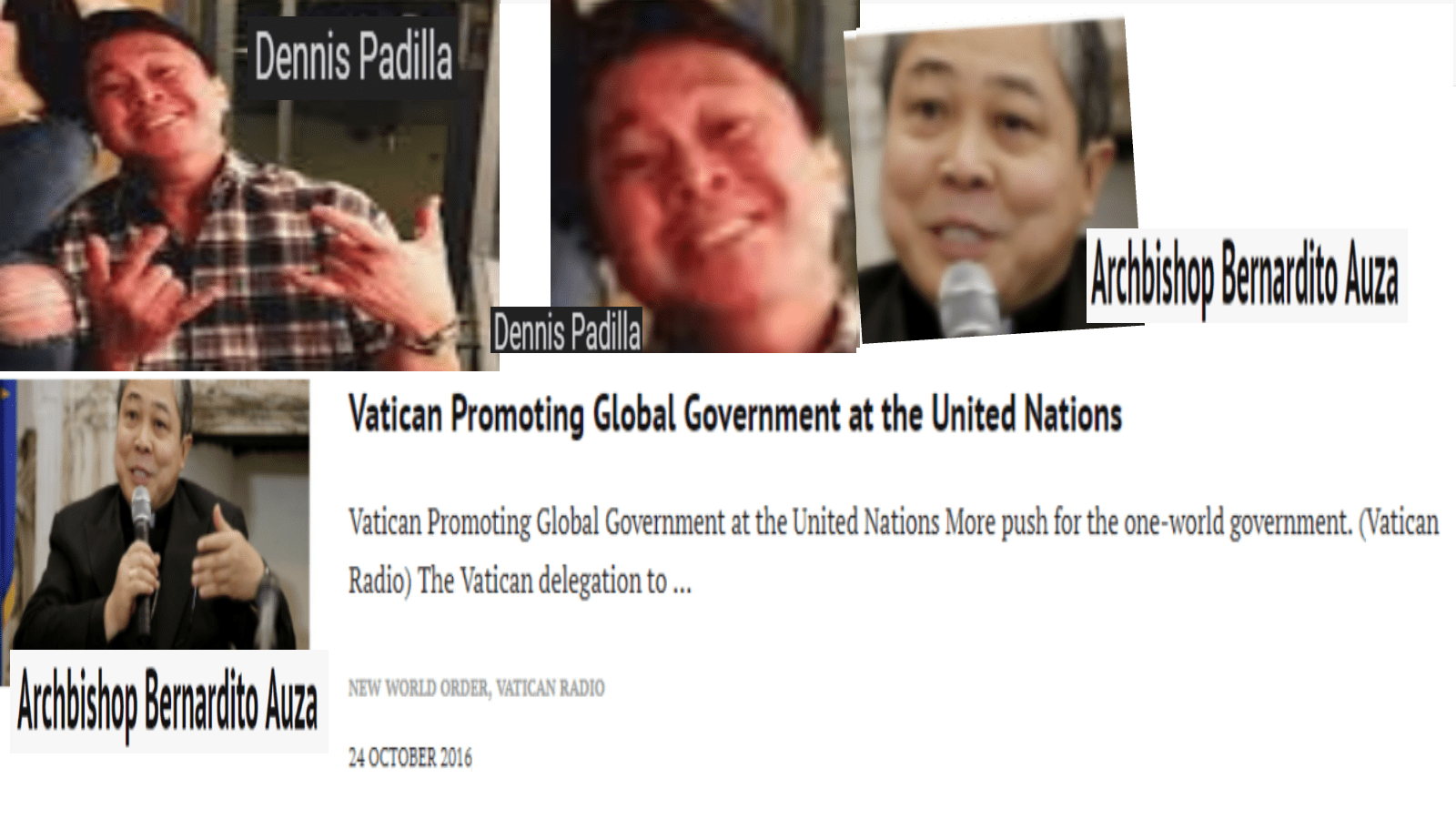August 27, 2018August 27, 2018 Vatican Ambassador to the United Nations, Archbishop Bernardito Auza = Dennis Padilla, Filipino comedian … EXPOSED HERE 1ST! Share this: Share on X (Opens in new window) X Share on Facebook (Opens in new window) Facebook Like Loading... Related