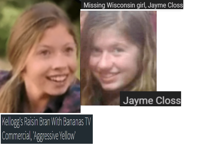 October 18, 2018 Missing girl, JAYME CLOSS = girl on recent Kellogg’s Raisin Brand TV commercial … Exposed here 1st! Share this: Share on X (Opens in new window) X Share on Facebook (Opens in new window) Facebook Like Loading... Related