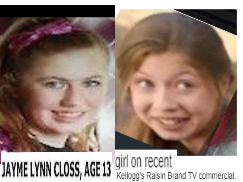 October 18, 2018October 18, 2018 Missing girl, JAYME CLOSS = girl on recent Kellogg’s Raisin Brand TV commercial … Exposed here 1st! Share this: Share on X (Opens in new window) X Share on Facebook (Opens in new window) Facebook Like Loading... Related