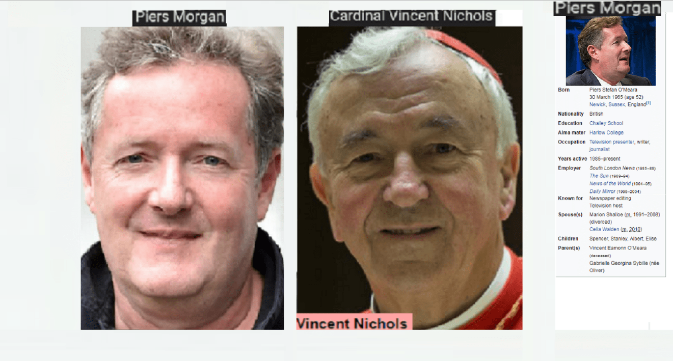 October 24, 2018 BRITISH CARDINAL VINCENT NICHOLS = PIERS MORGAN, BBC PRESENTER … EXPOSED HERE 1ST! Share this: Share on X (Opens in new window) X Share on Facebook (Opens in new window) Facebook Like Loading... Related