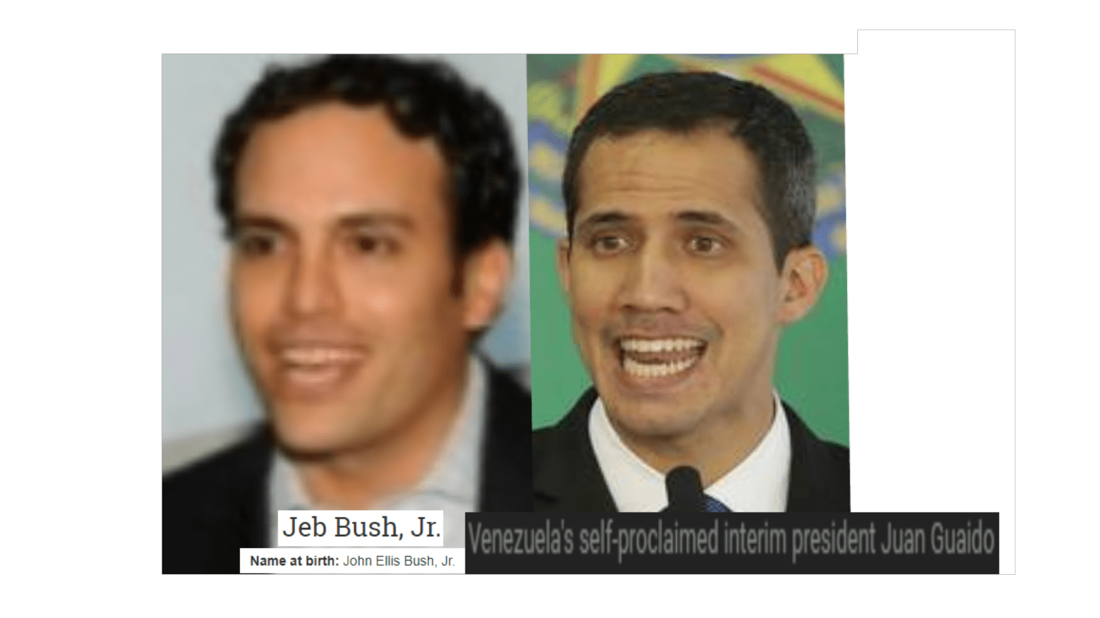 March 7, 2019 Venezuelan self-proclaimed interim president, JUAN GUAIDO = JEB BUSH JR. ….. Exposed here 1st! Share this: Share on X (Opens in new window) X Share on Facebook (Opens in new window) Facebook Like Loading... Related