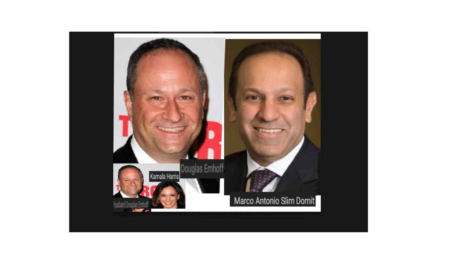 March 8, 2019March 12, 2019 Presidential candidate, U.S. Senator Kamala Harris’ husband: DOUGLAS EMHOFF = MARCO ANTONIO SLIM DOMIT, son of the richest man in Mexico: Carlos Slim Helu … Exposed here 1st! Share this: Share on X (Opens in new window) X Share on Facebook (Opens in new window) Facebook Like Loading... Related