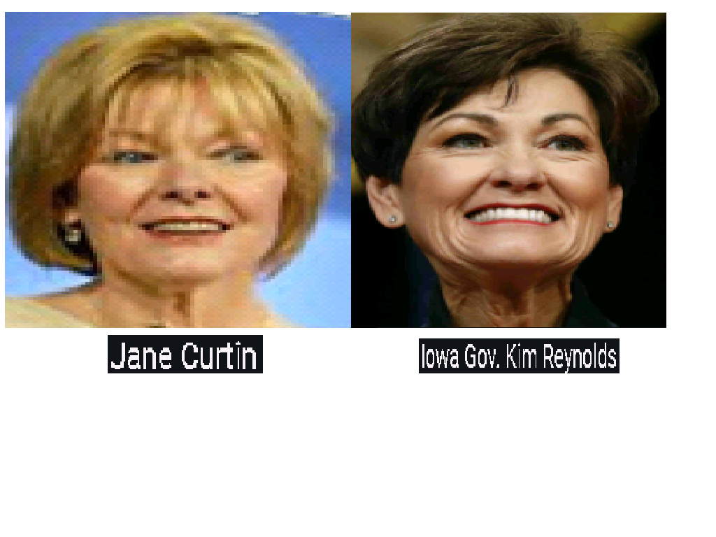 March 20, 2020March 24, 2020 Iowa’s Gov. KIM REYNOLDS = JANE CURTIN, comedic actress from the “SNL” TV show. Exposed here 1st! Share this: Share on X (Opens in new window) X Share on Facebook (Opens in new window) Facebook Like Loading... Related