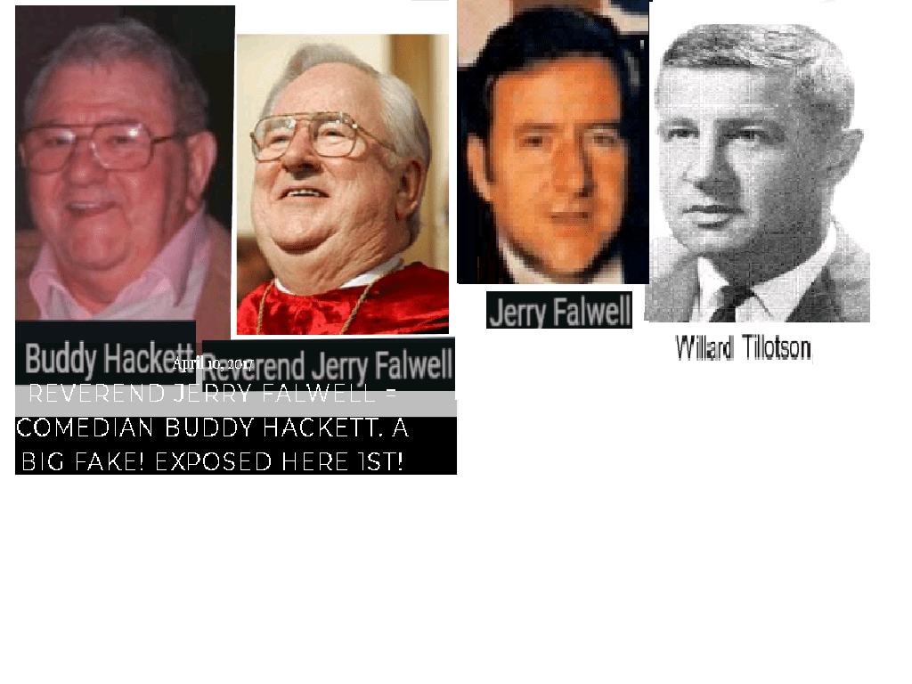 March 22, 2020May 1, 2020 REV. JERRY FALWELL SR. = WILLARD TILLOTSON, billionaire financier = BUDDY HACKETT, movie & TV comedian …. Exposed here 1st! Share this: Share on X (Opens in new window) X Share on Facebook (Opens in new window) Facebook Like Loading... Related