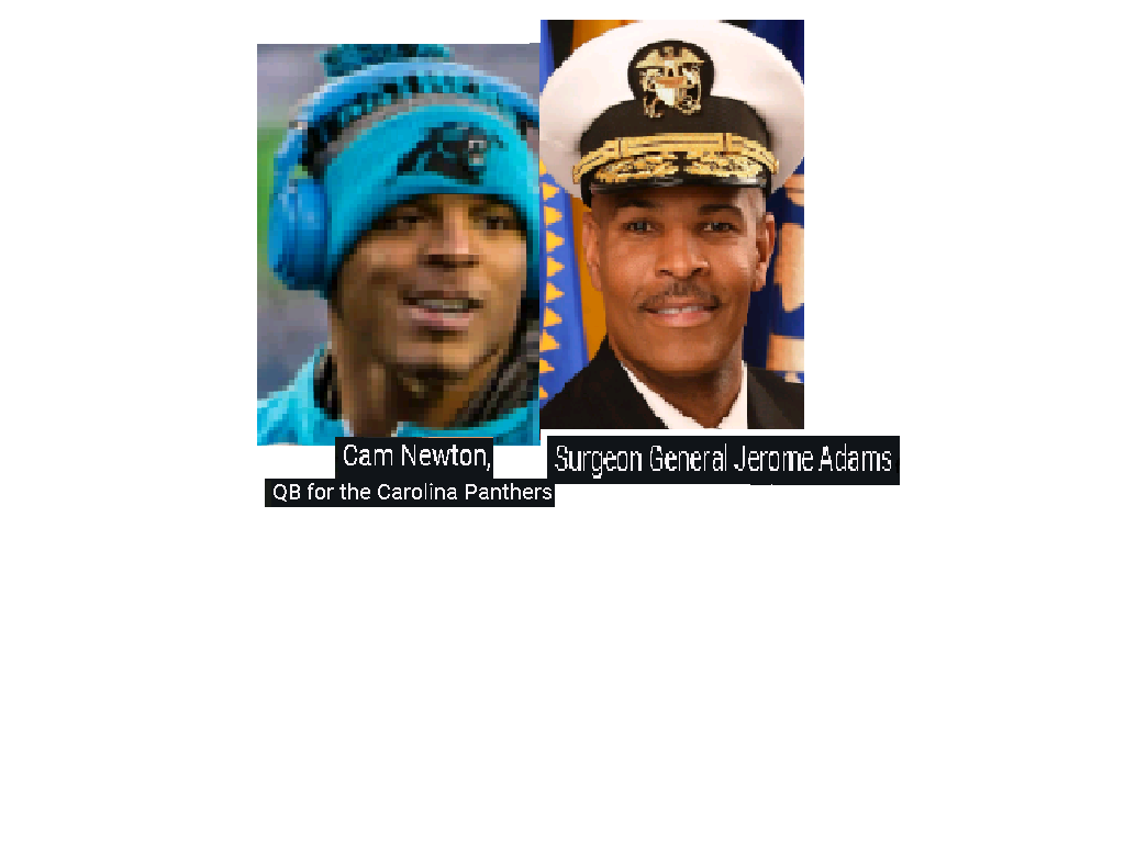 April 12, 2020April 12, 2020 U.S. Surgeon General, JEROME ADAMS = CAM NEWTON, NFL pro QB. Exposed here 1st Share this: Share on X (Opens in new window) X Share on Facebook (Opens in new window) Facebook Like Loading... Related