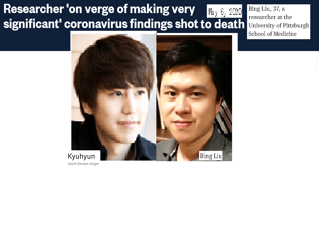 May 8, 2020 HOAX: C-o-v-i-d 19 researcher murdered, DR. BING LIU, age 37= CHO KYUHYUN, age 32 South Korean singer …….. Exposed here 1st! Share this: Share on X (Opens in new window) X Share on Facebook (Opens in new window) Facebook Like Loading... Related
