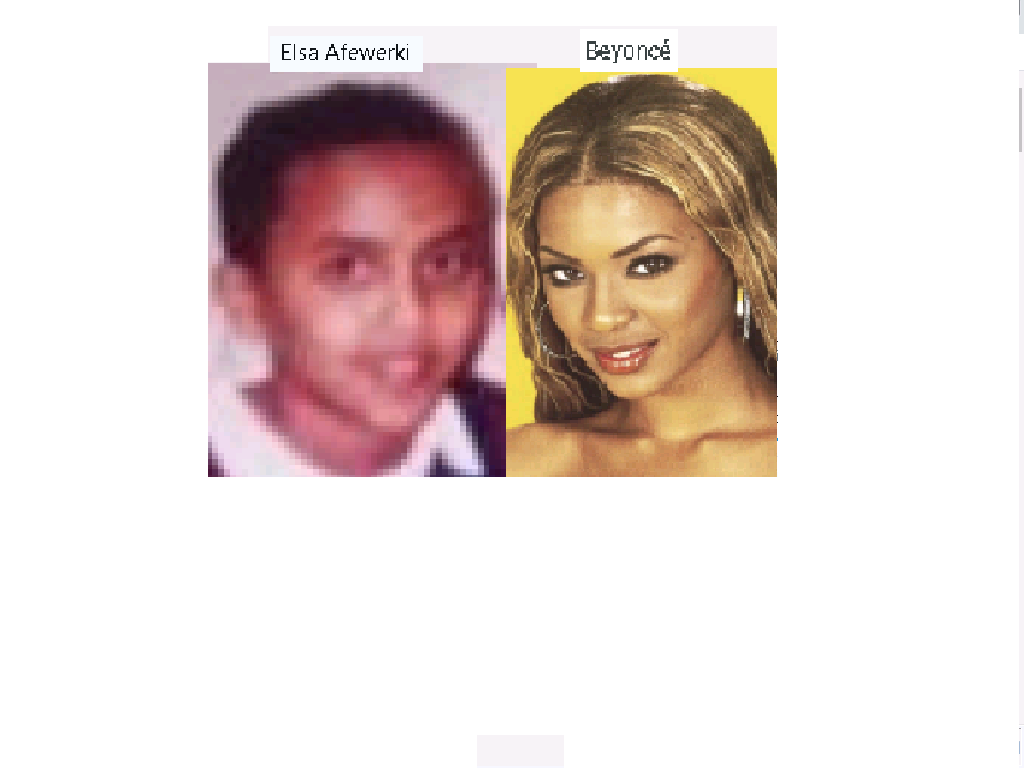 June 27, 2020June 27, 2020 Singer, BEYONCE KNOWLES = ELSA AFEWERKI, whose father is president of Eritrea ………….. Exposed here 1st! Share this: Click to share on X (Opens in new window) X Click to share on Facebook (Opens in new window) Facebook Like Loading... Related