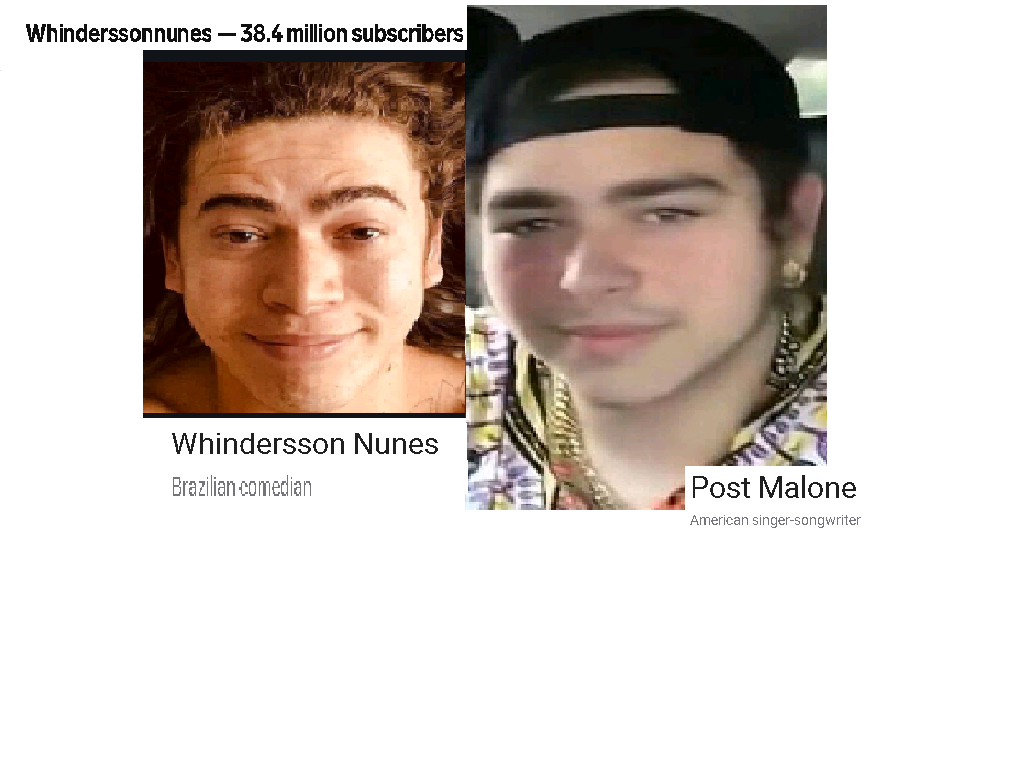 July 10, 2020 YouTube star, comedian WHINDERSSON NUNES = POST MALONE, age 25 = POST MALONE, American singer-songwriter, age 25 ……… Exposed here 1st! Share this: Share on X (Opens in new window) X Share on Facebook (Opens in new window) Facebook Like Loading... Related