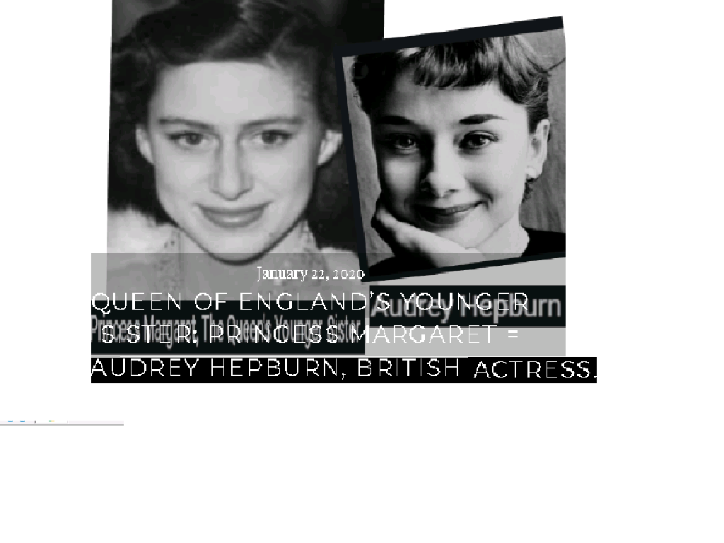 November 14, 2020November 15, 2020 Actress AUDREY HEPBURN = PRINCESS MARGARET, the sister of Queen Elizabeth of Britain … Exposed here 1st! Share this: Share on X (Opens in new window) X Share on Facebook (Opens in new window) Facebook Like Loading... Related