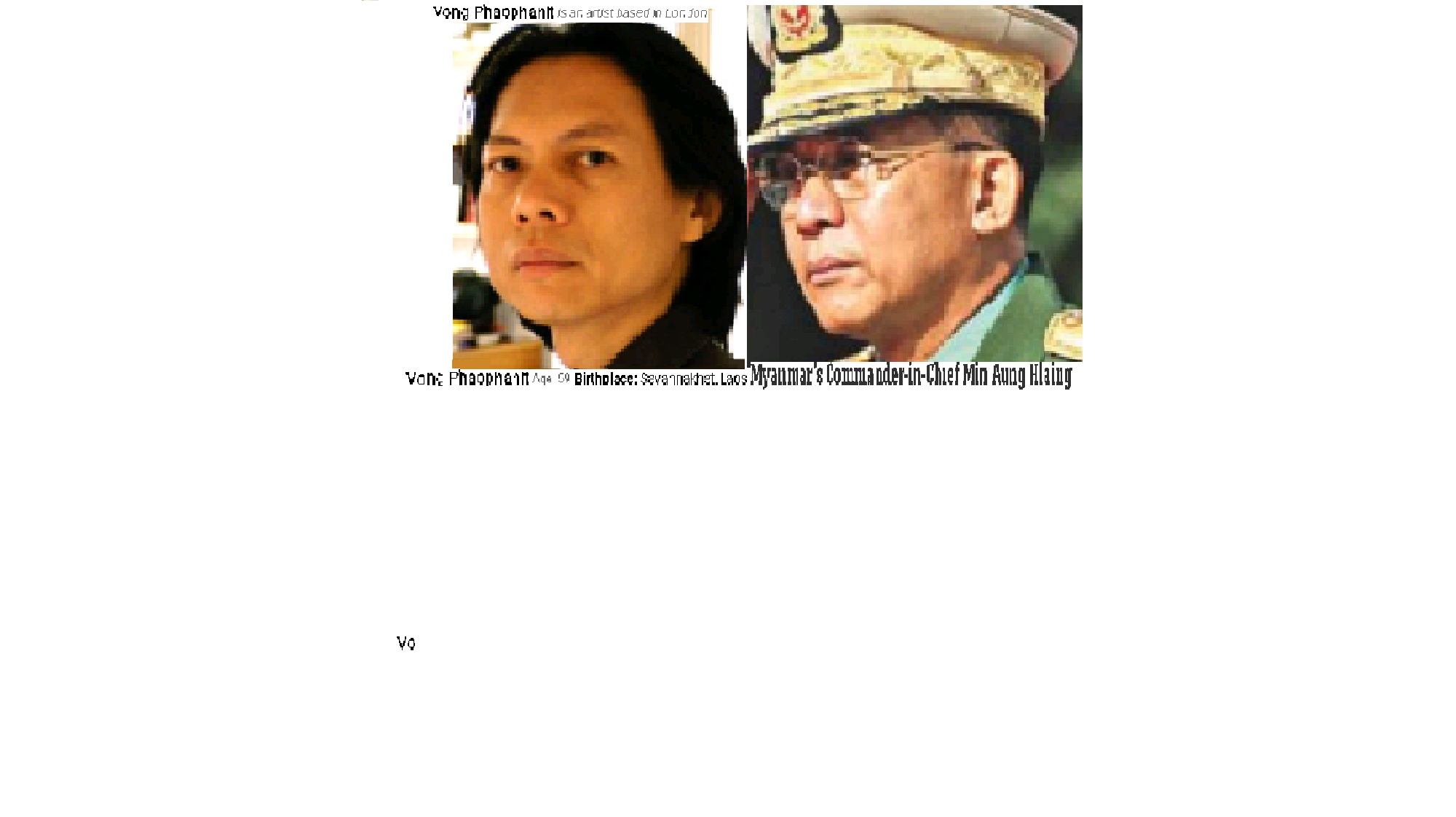 February 1, 2021February 1, 2021 Myanmar’s (Burma’s) new leader as of Jan. 2021, Senior General Min Aung Hlaing = Vong Phaophanit, London-based artist from Laos. Exposed here 1st! Share this: Share on X (Opens in new window) X Share on Facebook (Opens in new window) Facebook Like Loading... Related
