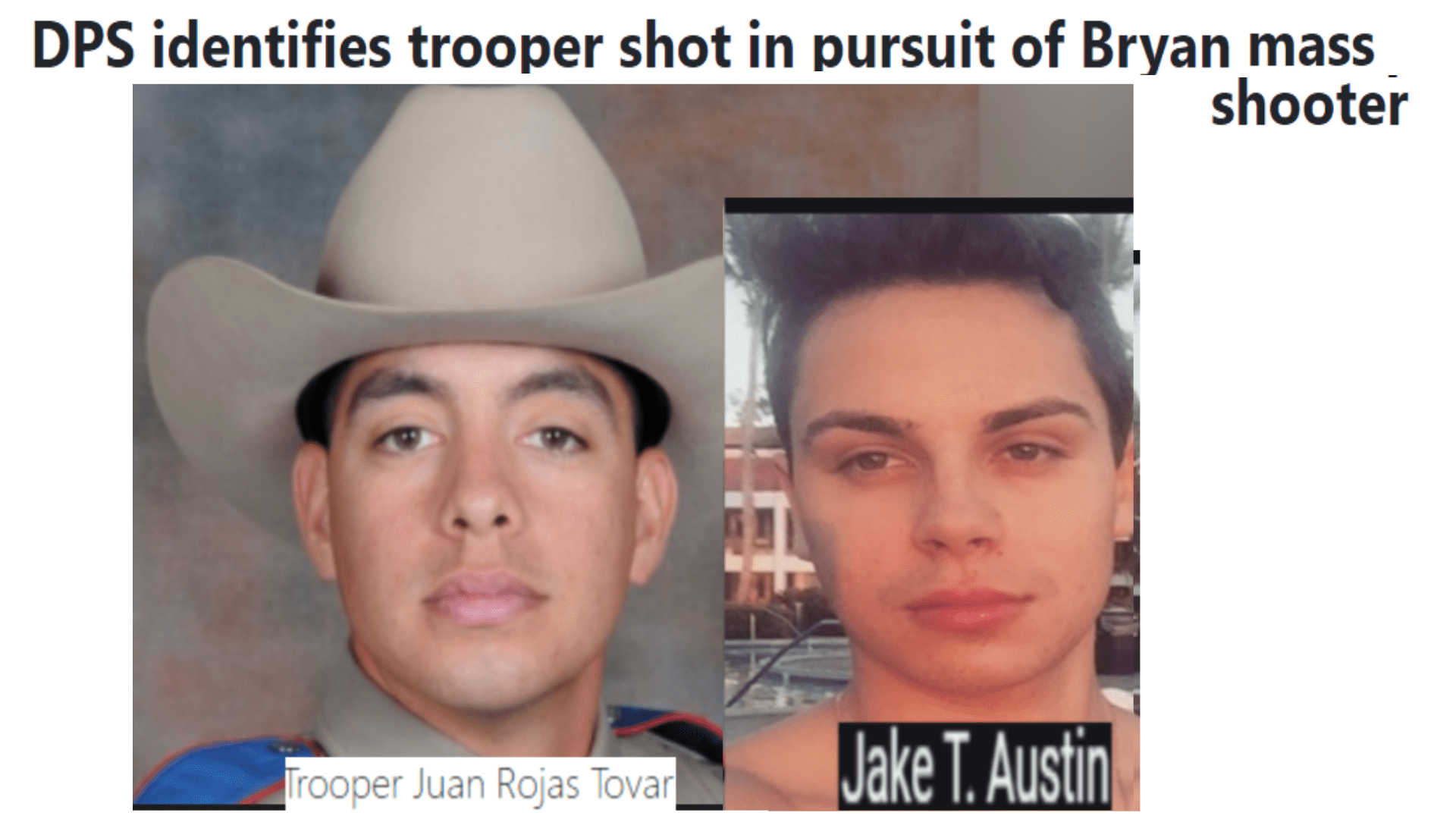 April 10, 2021 FAKE MASS SHOOTING! Texas state-trooper shot in pursuit of Bryan City mass-shooter, TROOPER JUAN ROJAS TOVAR = actor, JAKE T. AUSTIN … Exposed here 1st! Share this: Share on X (Opens in new window) X Share on Facebook (Opens in new window) Facebook Like Loading... Related