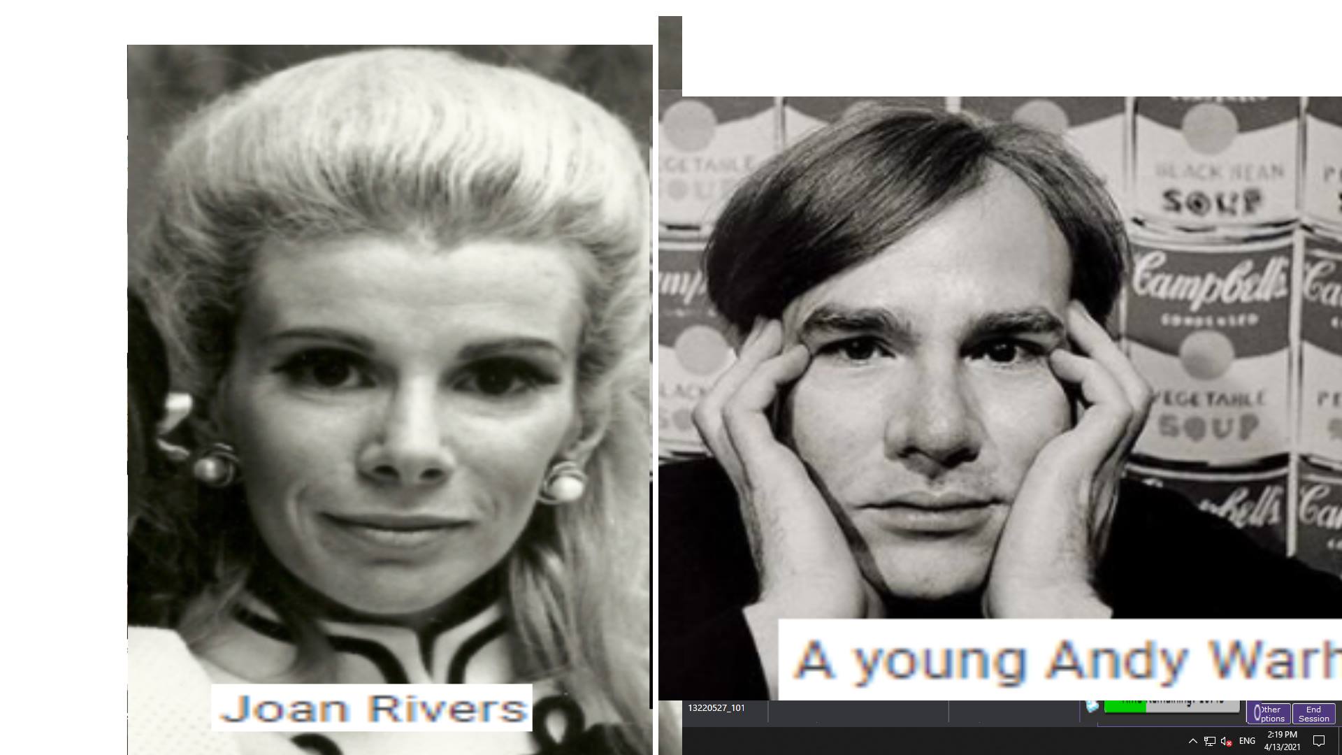 April 14, 2021 Comedienne JOAN RIVERS = artist ANDY WARHOL … Exposed here 1st! Exposed here 1st! Share this: Share on X (Opens in new window) X Share on Facebook (Opens in new window) Facebook Like Loading... Related