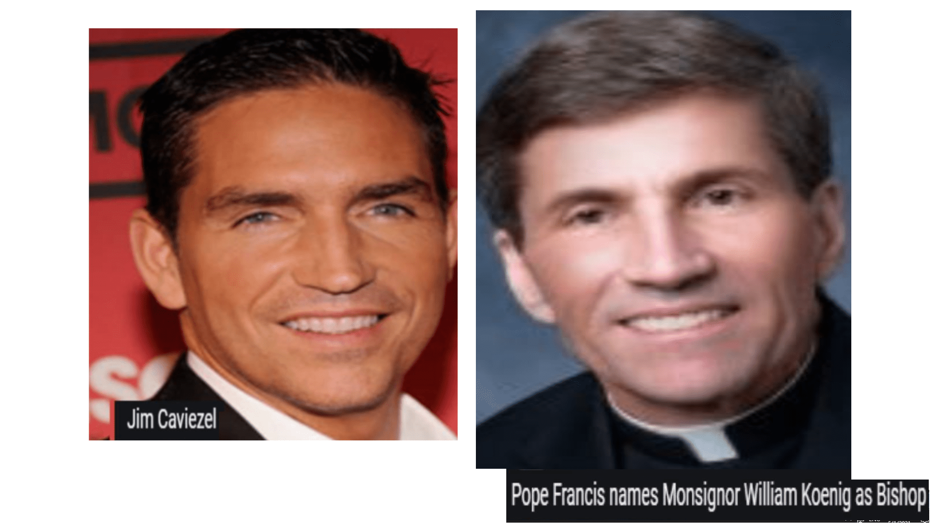 May 4, 2021 Actor JIM CAVIEZEL who played Jesus in Mel Gibson’s “Passion of Christ” Movie = newly appointed BISHOP WILLIAM KOENIG of Wilmington, Delaware USA which makes him Pres. Joe Biden’s bishop so that he won’t excommunicate Joe Biden. Share this: Share on X (Opens in new window) X Share on Facebook (Opens in new window) Facebook Like Loading... Related