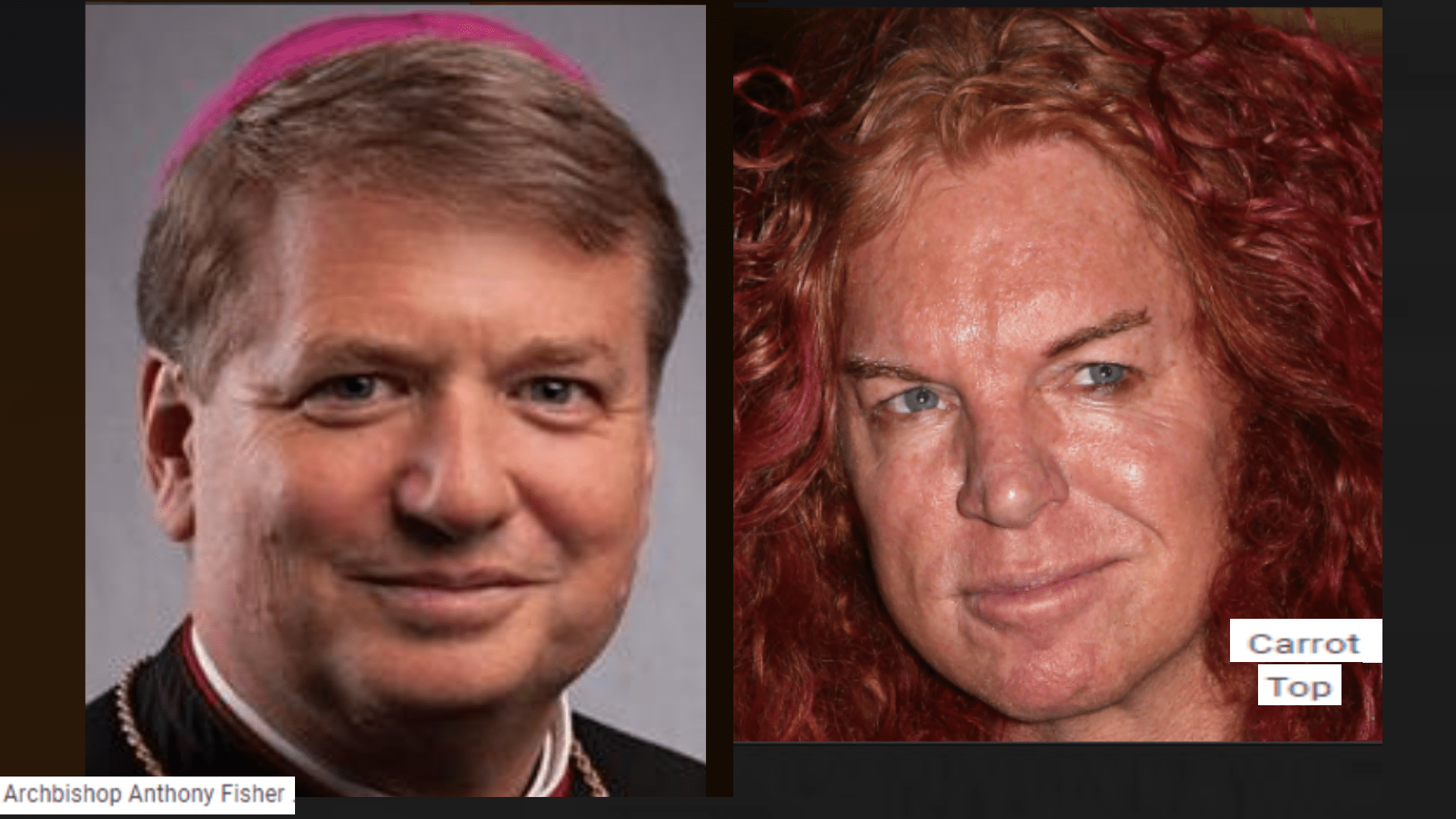 November 15, 2021 Roman Catholic Archbishop Fisher of Sydney, Australia = Carrot Top, comedian ….. Exposed here 1st! Share this: Share on X (Opens in new window) X Share on Facebook (Opens in new window) Facebook Like Loading... Related