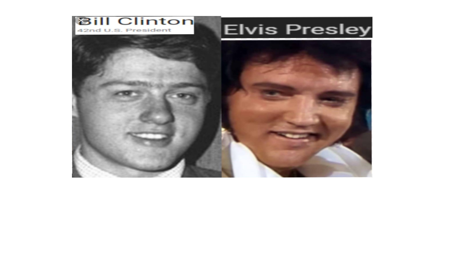 December 26, 2021December 26, 2021 Singer, ELVIS PRESLEY = BILL CLINTON, former U.S. president Share this: Share on X (Opens in new window) X Share on Facebook (Opens in new window) Facebook Like Loading... Related