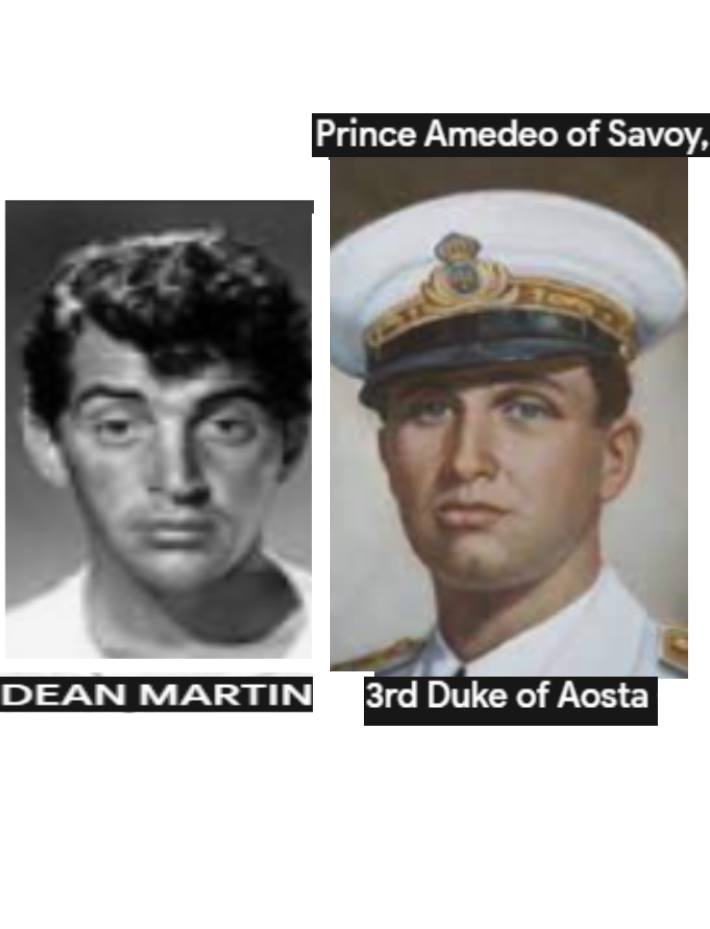 May 11, 2022 Movie star and singer: DEAN MARTIN = PRINCE AMEDEO of Savoy, 3rd Duke of Aosta, Italy …… EXPOSED HERE 1ST! Share this: Share on X (Opens in new window) X Share on Facebook (Opens in new window) Facebook Like Loading... Related