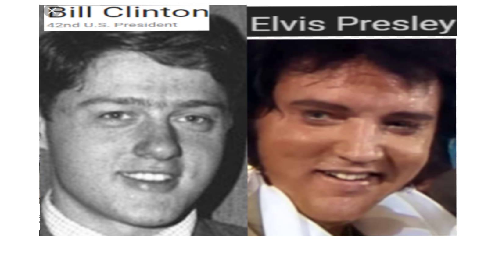 October 1, 2022 Singer, ELVIS PRESLEY = BILL CLINTON, former U.S. president. Share this: Share on X (Opens in new window) X Share on Facebook (Opens in new window) Facebook Like Loading... Related