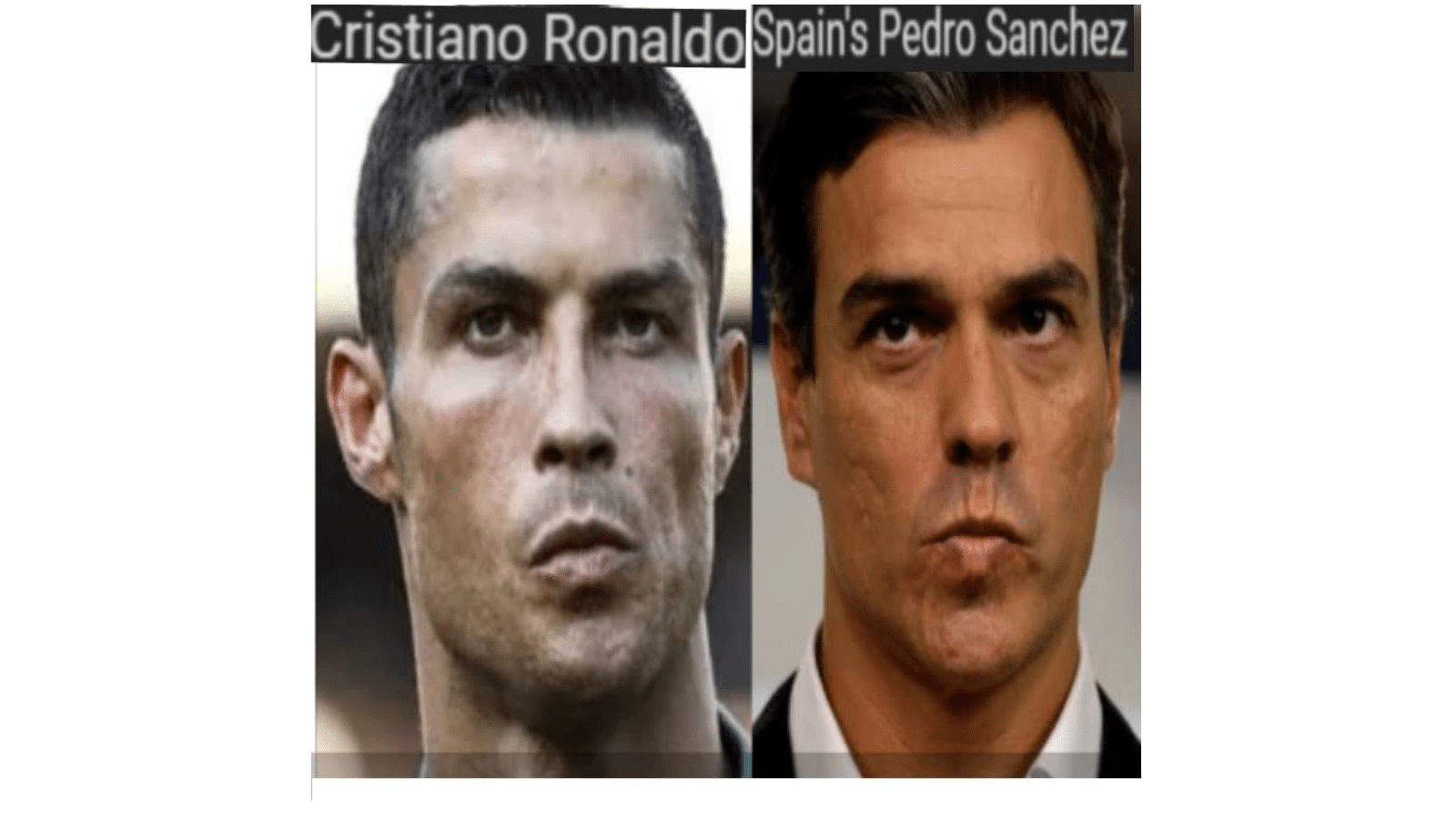 June 26, 2023 Prime Minister of Spain, PEDRO SANCHEZ = CRISTIANO RONALDO, soccer player ……………………………………………. Exposed here 1st! Share this: Share on X (Opens in new window) X Share on Facebook (Opens in new window) Facebook Like Loading... Related